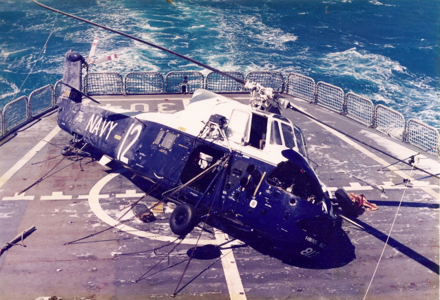 The Wessex helo had just landed on the deck of Success (the replacement tanker for Supply). When the ship dipped on a large wave and a gust of wind hit her and flipped onto her side.